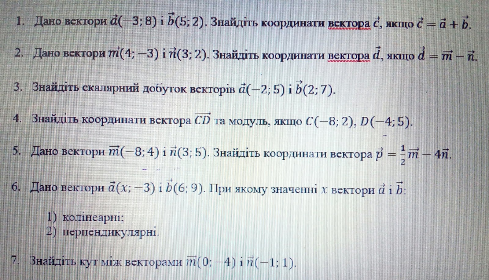- дії над векторами: додавання, віднімання векторів та множення на число;